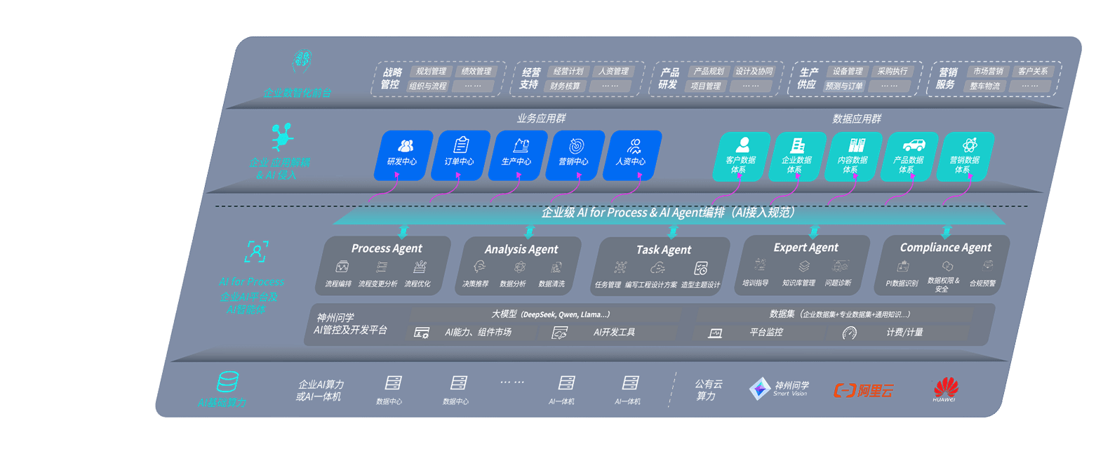 端到端的一站式AI工作空间深度融合了从企业战略规划到日常经营的全流程业务板块,,,,定向解决车企内部领域多、、、部门多、、、、链条长、、场景碎片化等难题,,支持车企快速构建以AI为核心的生产力写作体系,,,实现任务执行与AI能力的无缝集成与交互