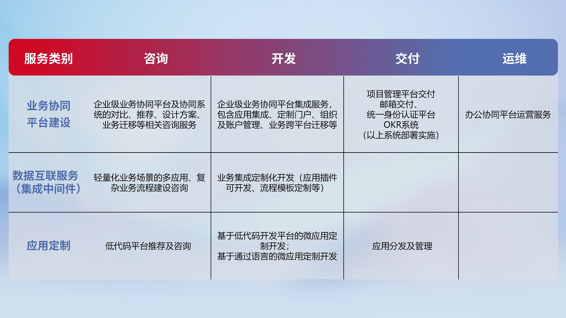 针对钉钉、、、企微、、、IDaas等平台级产品提供产品的规划、、、方案、、交付、、、定制化开发等服务,,实现如统一协同办公、、、、智能客户服务、、混合会议管理、、智能数据查询、、等业务场景,,实现数字化转型。。。